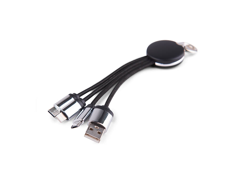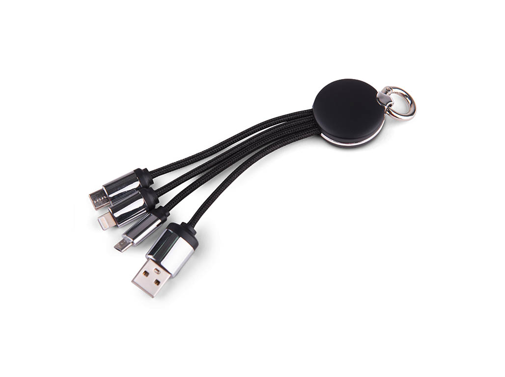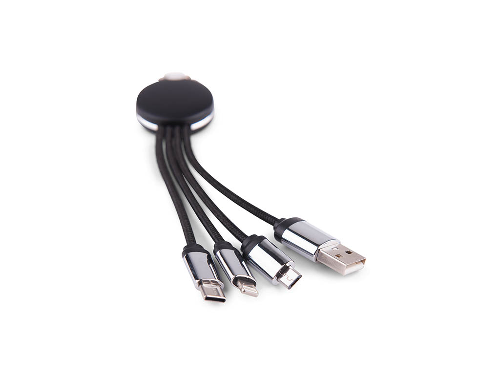 4-IN-1 charging cable with 15cm braided USB cable and LED light. Comes with Type C, Lightning, and Micro USB and it can be added to your key ring.
