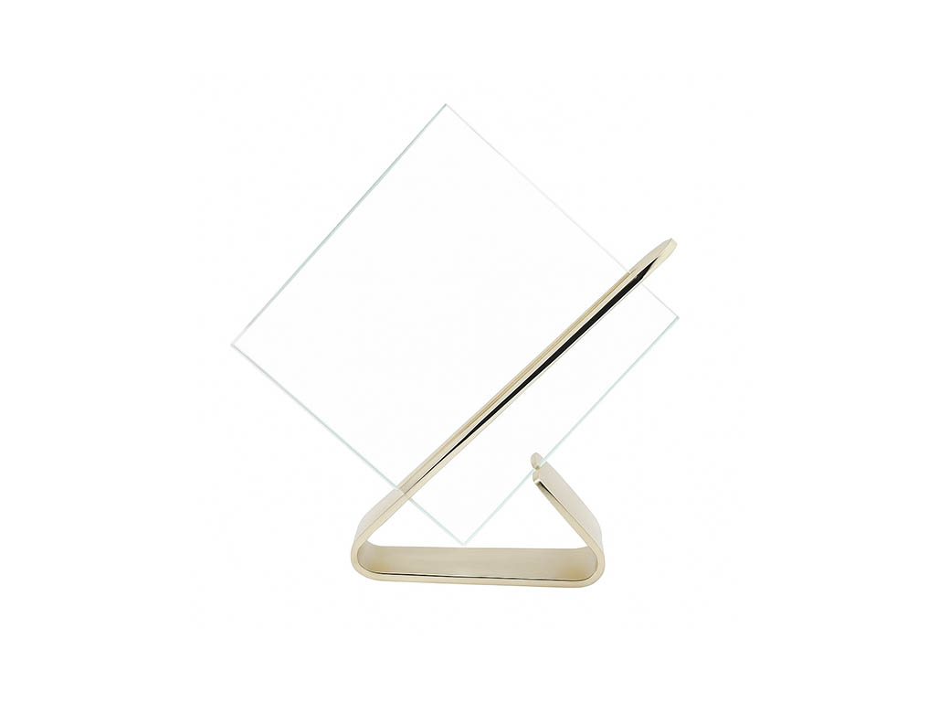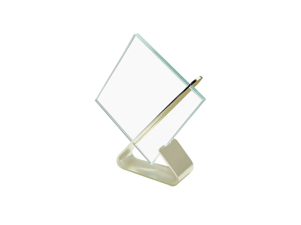 A diamond-shaped trophy with a sleek metal base exudes elegance and modern sophistication. The trophy features a clear glass or crystal pane, cut precisely into a diamond silhouette that captures and reflects light beautifully from every angle.