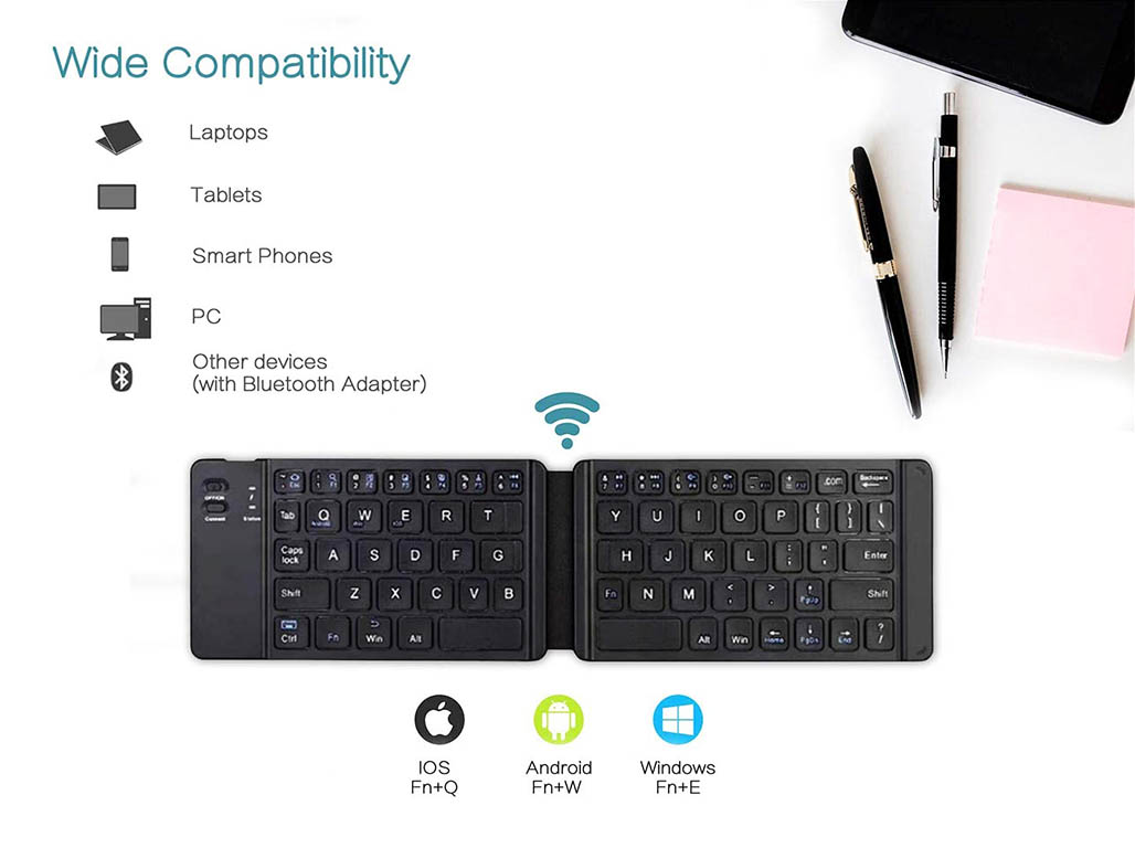 Small and light which can be easily put into the clothes pocket and cosmetic bag, and can be input on the mobile phone and tablet with both hands anytime and anywhere. System supports Apple, Android, Windows, Smartphones and Lighter Tablets.