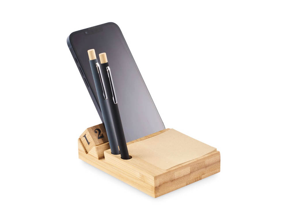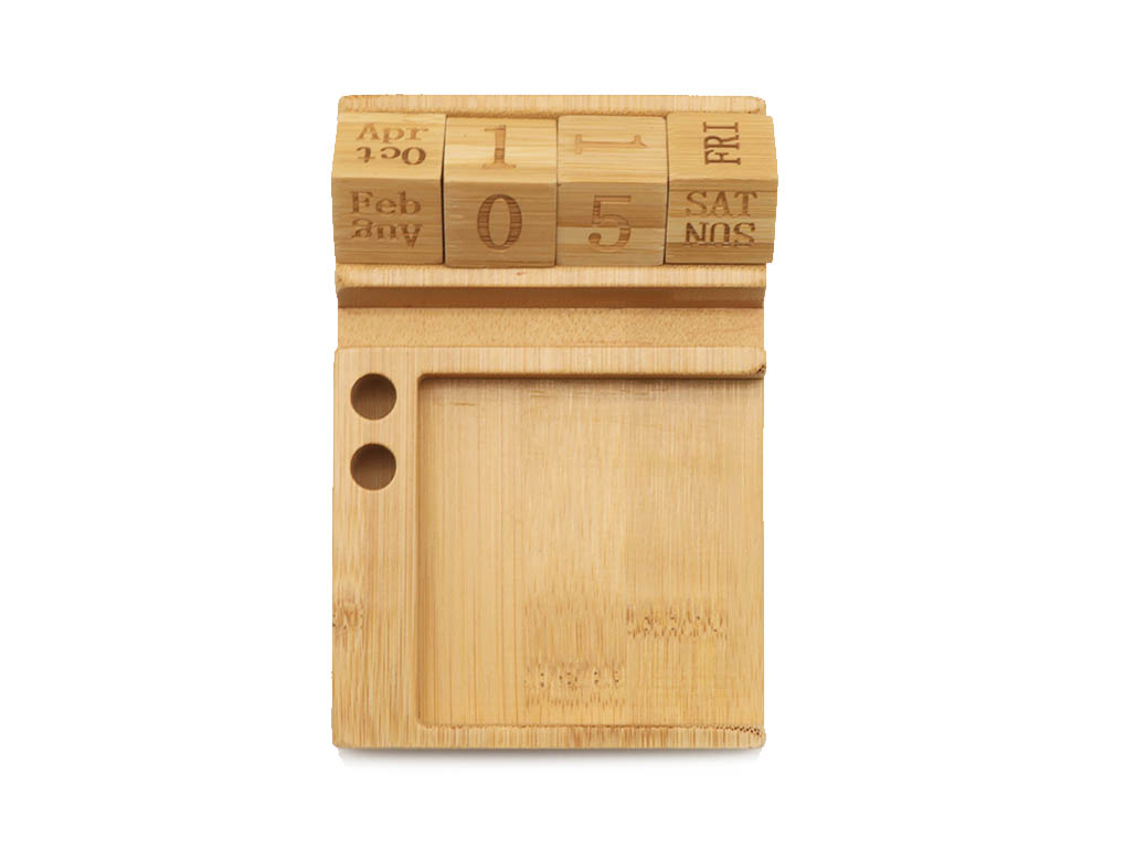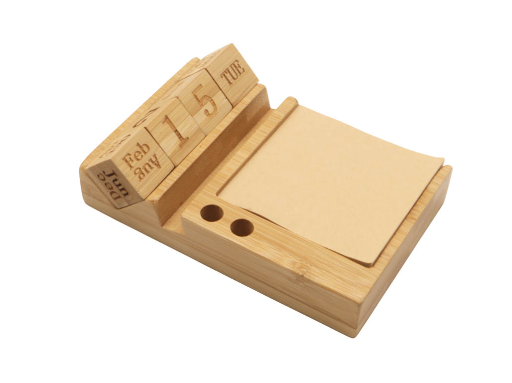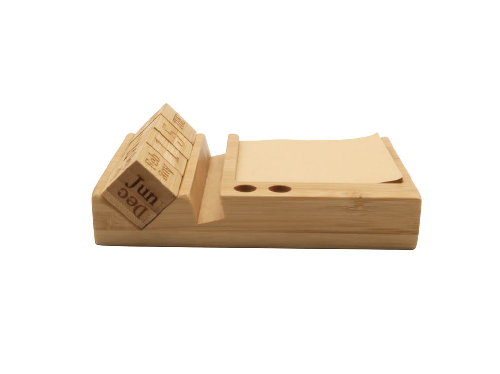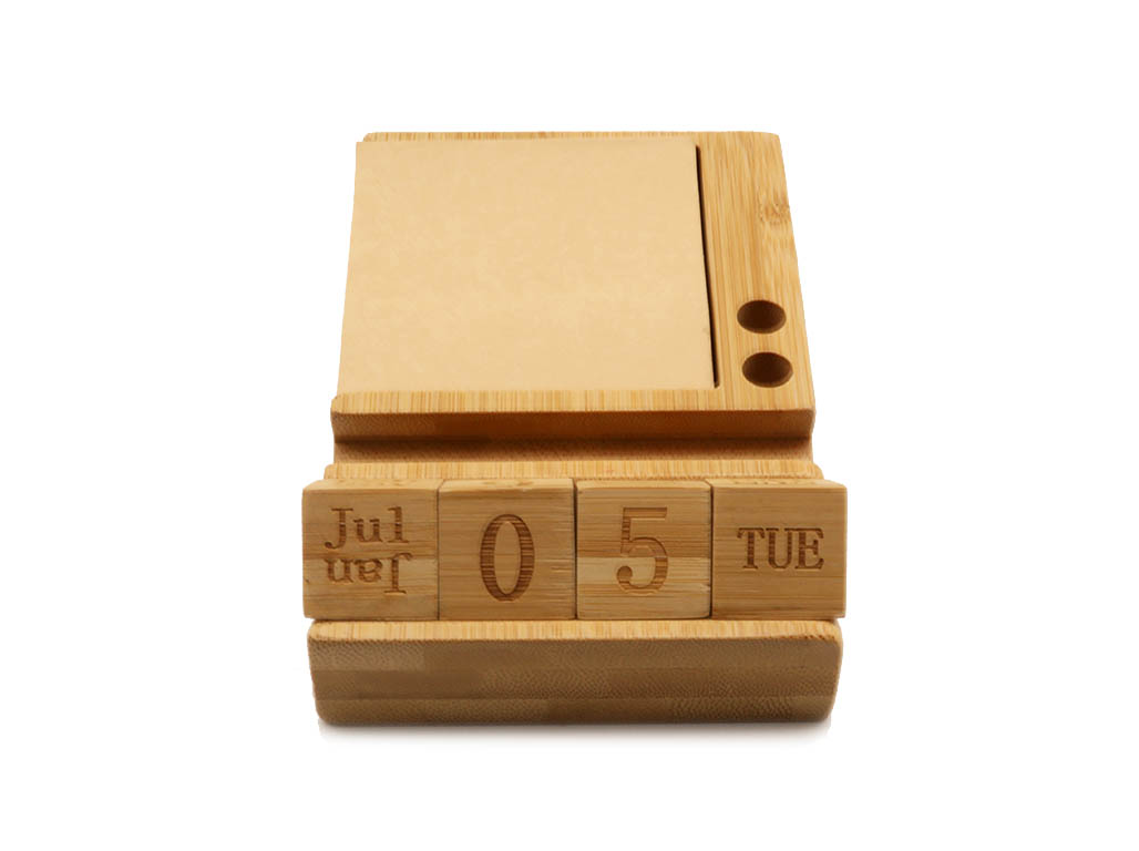 Bamboo desktop calendar with phone holder functionality, 2 pen holders and 50 sticky note sheets.