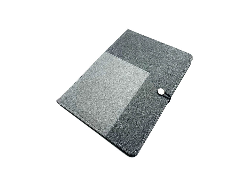 A notebook made of Fabric with Elastic Band on the Metal Closure and pockets to hold a business card holder and a pen that is useful and elegant promotional and corporate gifts for your customers.