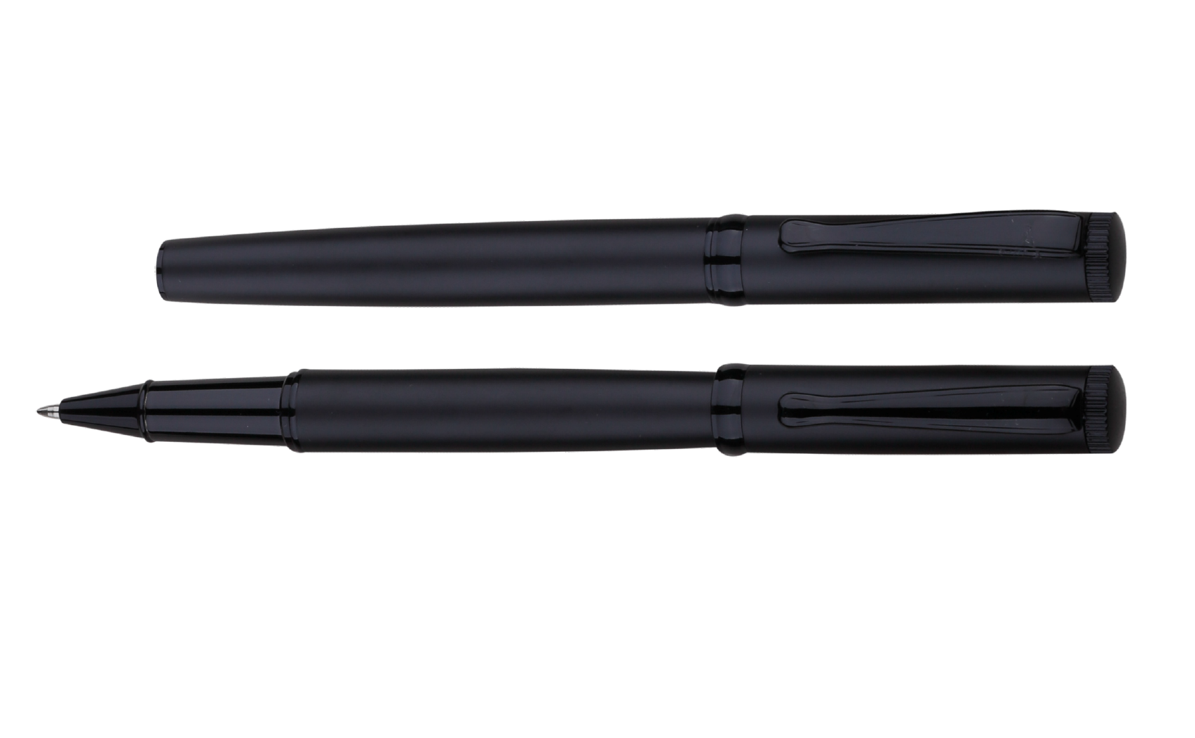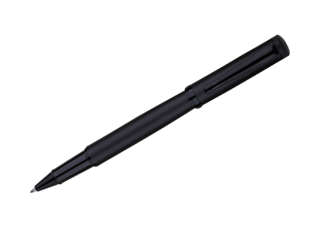 Matte black metal roller pen with a sleek barrel and cap, featuring a Parker-style metal refill with blue ink and complemented by shiny black accents.
