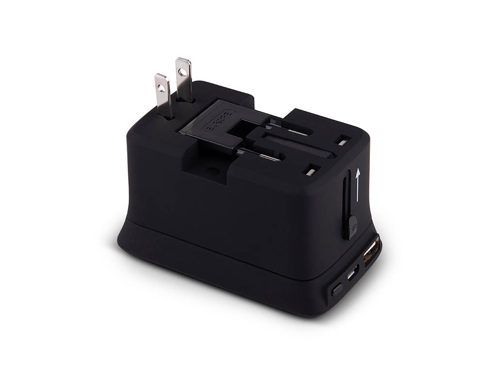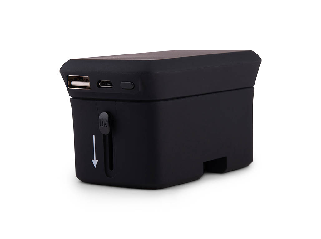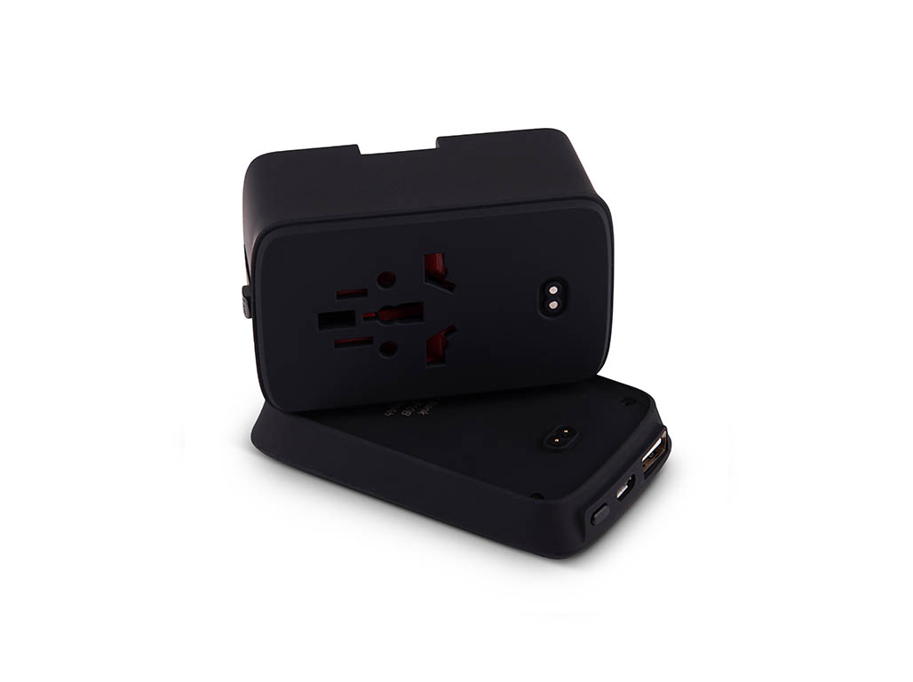 Universal World Travel Adapter with a detachable 5000mAh power bank. The adapter has USB and Type C outputs to charge 2 devices simultaneously & is compatible with over 150 countries with US/EU/UK/AUS plugs. Just push the knob of the plug you want to charge & your device will charge safely in almost any part of the world. Attached to the Universal travel adapter is a 5000mAh detachable Powerbank, which is equipped with a high-density Li-Polymer battery that safely charges almost any of your electronic devices very quickly.